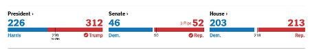 At the time of writing (Monday 11th November), it is still not certain whether the Republican victory is a clean-sweep (White House + Senate + House). It is certain that two of the three legs (White House + Senate) are Republican and votes are still being counted in the race for the House. The New York Times counter is below.