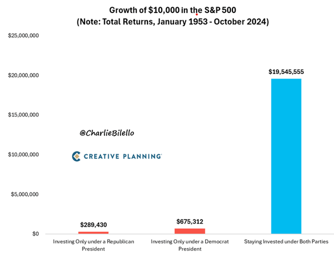 UPDATED - interesting chart below on investing with only Republican Presidents or only Democratic Presidents or staying invested with either.