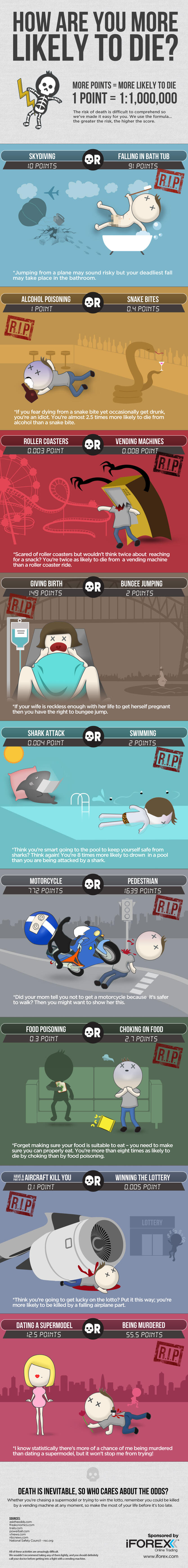 This amusing infographic reminds us to make the most of life (and to have all our life insurance in place and up to date!). Check out some interesting statistics on what the likelihood is that you will be killed by part of an aircraft falling on you, being eaten by a shark, or just walking across the road!