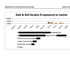 After the personalised ethical investment analysis for each client we have a full list of their 'nasties' and $ and % exposure - we report by category and the top 10 companies, but the information is available for us answer any clients queries. We have had questions relating to wanting no exposure to weapons, Amazon and DGL to name a few and were able to tell the clients exactly what their exposure is.