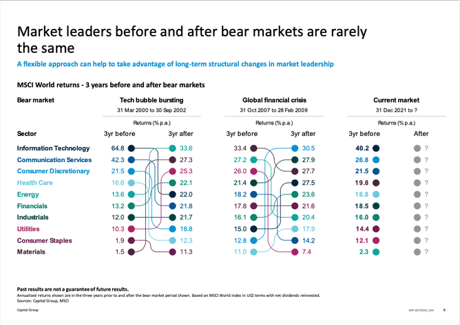 Information Technology led in the 3 years before the 2000 tech bubble burst, but fell to 5th in the 3 years after. But, it also led in the Global Financial Crisis (fell to number 3 after) AND in the 3 years up to this bear market. However, the actual companies that led in each occasion were different to the actual companies in the next bull market.