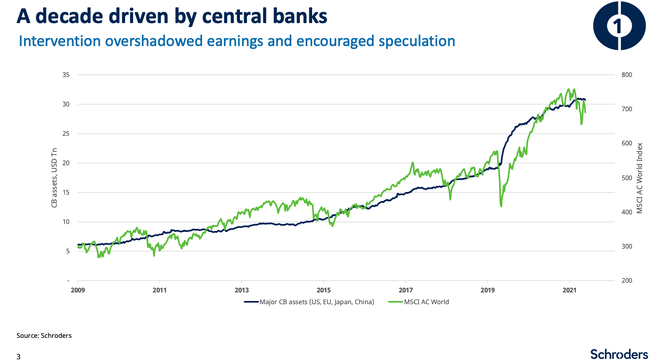 This is a closely co-related chart between the world share index (MSCI AC World) and the Amount of Central Bank Assets. Thanks to Schroders for this one.