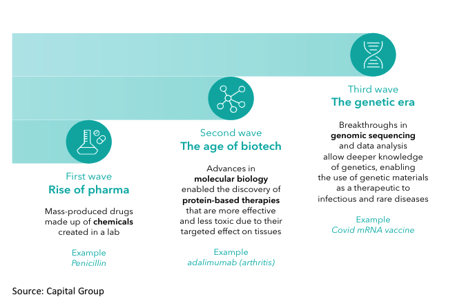 Capital considers that biopharma is in the midst of a 'third wave' of innovation. Referring the picture above, the first two waves were: