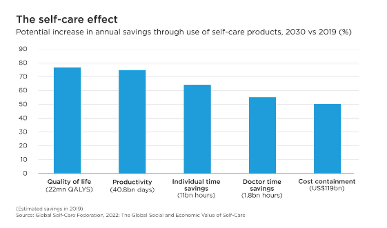 Self-care products: One study estimates that the use of self-care products saves 22 million quality-adjusted life years each year, and this could increase to 39 million by 2030. For every US$1 Spent on consumer healthcare, it is estimated that this generates US$7 in future healthcare savings (because over the counter medicines are more affordable than prescription drugs, and doctors’ visits are avoided for minor ailments.)