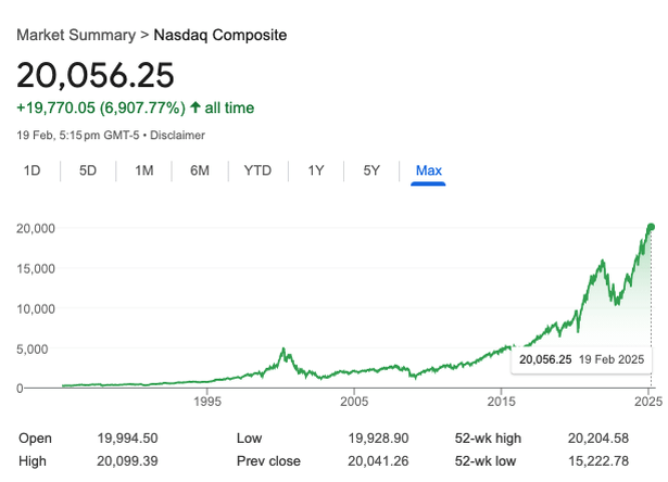 It launched in 1971 with a starting value of 100 and has experienced periods of explosive growth, like during the dot-com boom of the late 1990s, as well as significant corrections. {See the graph with this article]