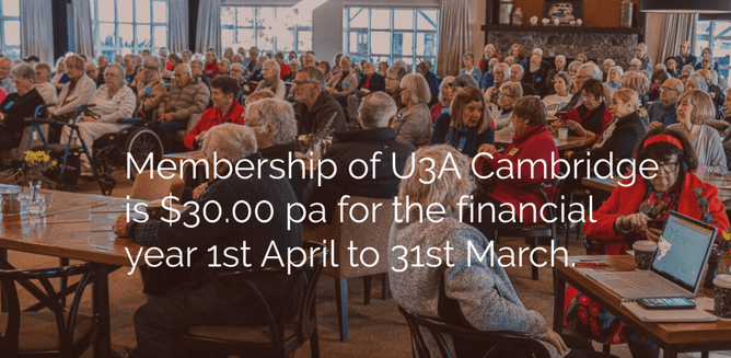 While U3A Cambridge is open to any one to belong, our members tend to be mature/retired people who are interested in learning more and keeping their brains active. At $30 pa membership fee, it is a cost effective, social and educational thing to be involved with.