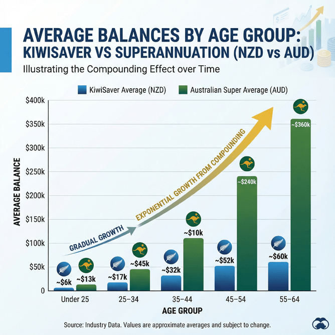 the average 55–64-year-old Australian now holds around AUD $360,000 in superannuation, while the average KiwiSaver member of the same age has around NZD $60,000.