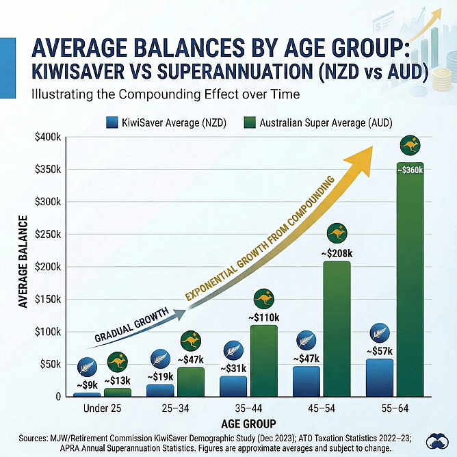 the average 55–64-year-old Australian now holds around AUD $360,000 in superannuation, while the average KiwiSaver member of the same age has around NZD $60,000.