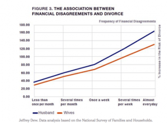 Couples who reported disagreeing about finance once a week were over 30 percent more likely to get divorced than those who reported disagreeing about finances a few times a month. Read the New York Times Article here.