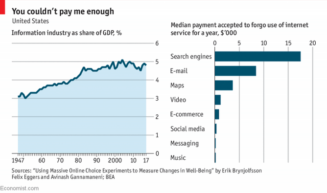 One way to quantify how much these internet services are worth is by asking people how much money they would have to be paid to forgo using them for a year. A new working paper by Erik Brynjolfsson, Felix Eggers and Avinash Gannamaneni, three economists, does exactly this and finds that the value for consumers of some internet services can be substantial. Survey respondents said that they would have to be paid $3,600 to give up internet maps for a year, and $8,400 to give up e-mail. Search engines appear to be especially valuable: consumers surveyed said that they would have to be paid $17,500 to forgo their use for a year.