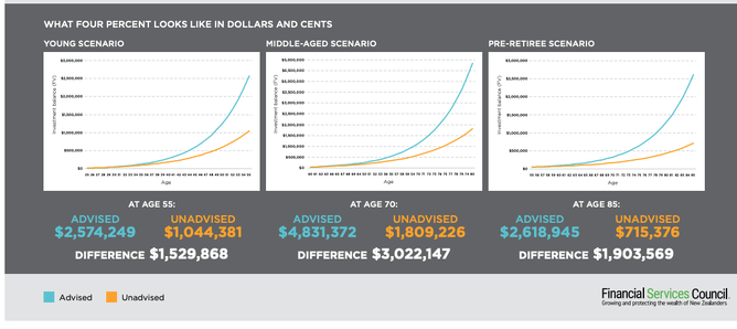 3. New Zealanders that get professional financial advice on average receive 4% better investment returns. Our model shows additional savings growth of: • Young (age 25): $1.5m • Middle-aged (age 40): $3m • Pre-retiree (age 55): $1.9m