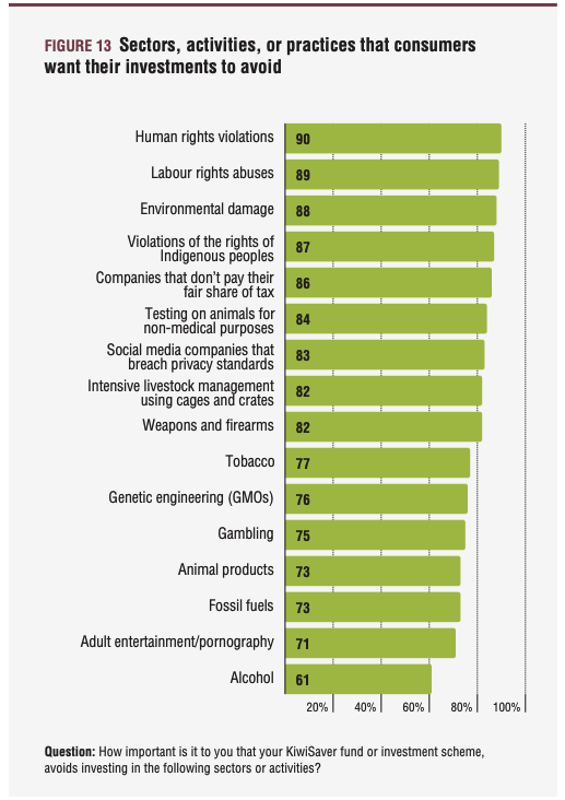 A new entrant is that 86% of people aren't happy with companies that don't pay their fair share of taxes, and there is still resistance to investing in weapons and firearms, tobacco, Genetic engineering, Gambling, fossil fuels, pornography and alcohol.
