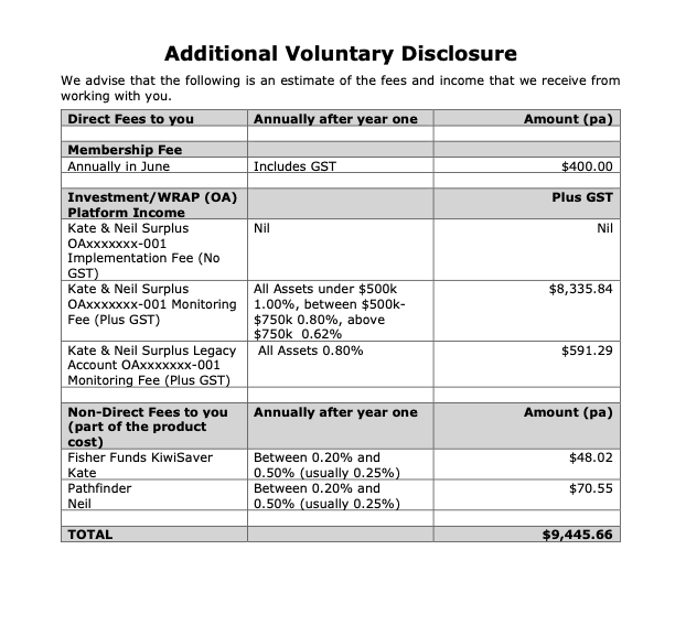 In addition to the legislatively required disclosure of fees and costs at the start of any engagement in % terms, since 2012 we have provided this information in $ terms as well.
