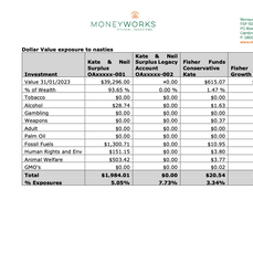 This reporting is the key that enables us to have confidence in our claims that we provide clients with Ethical investments. Using the Mindful Money research and combining it with the data crunching ability of our robot Millie, we are able to provide a personalised report for each client in their financial plan and each annual review, showing what 'nasties' they have exposure to.