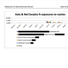 This works in conjunction with our education to build their ethical investing approach and enables us to tailor portfolios if for example a client is adamant that they don't want any exposure to weapons (which has happened).
